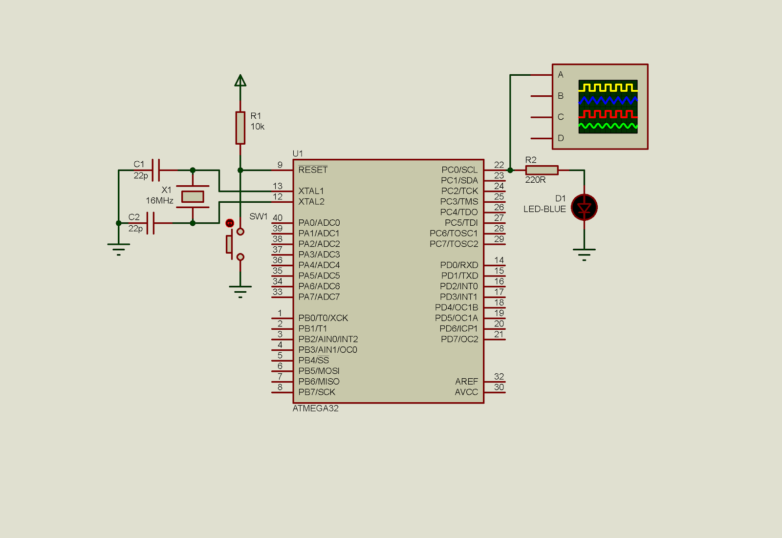 | Schematic Diagram. ATMega32 clocks at 16 MHz. PC0 toggles an output LED. A virtual oscilloscope track the output signal. |